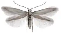 Adult moths are small (4–6 mm long with a 6–10 mm wingspan), very narrow and silvery brown in colour. They lack ocelli and maxillary palps. The wings are discal, sharply pointed and "fringed" or tattered looking. They are on the wing from May to July.[3] The head is grey; the antennae grey-whitish, very indistinctly ringed with grey. Forewings are shining grey, hindwings grey.[4]