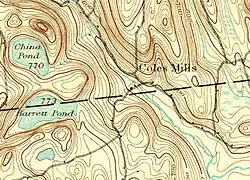 Cole's Mills was settled by Elisha Cole in 1747. Elisha and his wife Hannah Smalley moved from Harwich, Massachusetts, on Cape Cod.[4] He built a grist mill at the outlet of Barrett Pond into the West Branch of the Croton River in 1748. A carding mill, saw mill, and school house were added in subsequent years.[5][6] The land belonged to Frederick Philipse II, second Lord of the Philipsburg Manor; at some point it was leased. Mary Philipse inherited it in 1752, at age 22, as her share of the Philipse Patent (also known as the "Highland Patent"). In 1758 she married British army officer Roger Morris. After the Battles of Saratoga in 1777 during the American Revolutionary War the Commissioners of Forfeiture confiscated the land from the Morrises and sold it back to the tenants[7] for £234 on June 11, 1782.[8] Elisha and his sons were members of the 7th Regiment of the Dutchess County Militia, under Colonel Henry Ludington.[9] Just east of Cole's Mills, on the road to Carmel, New York, was the farm of Captain Solomon Hopkins, where the patriot and spy Enoch Crosby took refuge from the British.[10] Enoch Crosby was the hero of The Spy (Cooper novel) by James Fennimore Cooper.