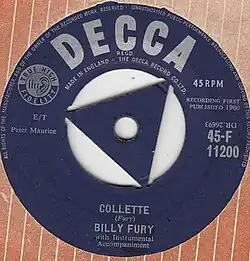 "Colette" (also spelled "Collette") is a song by English rock and roll singer Billy Fury, released as a single in January 1960. It peaked at number 9 on the Record Retailer Top 50, becoming Fury's first top-ten hit.[2]