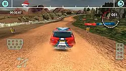 Colin McRae Rally is a racing video game in which players can drive cars in point-to-point rally events.[1] The game can be played from a behind-the-car perspective or from a bonnet camera view.[2] On mobile devices, cars can be steered using on-screen buttons which provide digital input or using tilt controls which provide analog input.[3][4] The game features thirty rally stages from Colin McRae Rally 2.0,[5] located in Australia, Corsica, and Greece.[2] Terrain and surfaces vary between stages ranging from smooth tarmac roads to gravely off-road tracks.[6] Track information is provided through verbal descriptions from the co-driver and icons that appear near the top of the screen.[7][8] The icons display the severity and difficulty of turns using colour-coding.[8] A progress indicator is also displayed on screen, so that the player can see how much of the course they have completed and compare their position to the computer drivers.[8]
