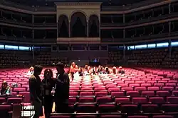 The Coliseu is actually two juxtapositioned buildings. This includes a rectangular three-story building, whose principal facade is oriented to the southwest. The first floor includes the Coliseu dos Recreios' atrium (94-98), the vestibule and bar-restaurant of the Sociedade de Geografia; the second floor, which as functions as library of the organization; and third floor, the Sala Portugal.[1] The rectangular area is internally divided into three areas supported by steel pillars/columns, and interlinked by steel staircase, allowing circulation vertically.[1] The twelve-sided events hall is encircled by seating and two floors of box seating. To the northeast and southwest, respectively, are special box seats, framed by three arches, over one of the three accesses. The hall is covered by metal ceiling, supported by steel tubing.[1]