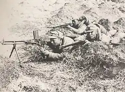 The majority of the work undertaken by the Nanjing Army was guard and police duty in the occupied territories, in order to free up Imperial Japanese Army troops to fight on more important fronts. One of their main tasks was to combat Communist guerrillas fighting in occupied zones. The other main task was to provide support for Japanese army units during their campaigns. Information on the exact details of their operations remain vague and hard to find, however it was known that they took part in several major actions during the war against both Communist partisans and the Nationalist Army.[7] Their first major pacification operation occurred to the east and northeast of Suzhou in May 1941. They fought in support of Japanese forces against the Communist New Fourth Army and gave the insurgents heavy casualties before they retreated out of the area. By fall, it was considered a success.[10] From 1941 to 1944 the troops of Wang's military fought with Japanese forces in a campaign to eliminate Nationalist insurgents in the area between Hangzhou and the Yangtze River.[11] Late in the war, with the defeat of Japan inevitable, several army units redeployed themselves in the Lower Yangtze region on orders of President Chen Gongbo.[3]