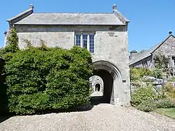 Gatehouse, Colleton Barton, viewed from south, with front door to Colleton Barton visible through gateway beyond