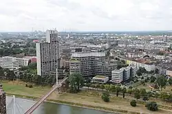 The smaller office tower was built by Neue Heimat and rented by the city of Mannheim to house the technical offices. In 1984, the city bought the office tower and the connecting wing with swimming pool and shop gallery for 32 million D-Marks. The swimming pool has been empty since 1990.[4] In contrast to the renovated residential tower, which is privately owned by a community of owners, the office tower is in need of renovation. The costs were estimated at over 70 million euros in 2013. The tower was therefore to be demolished.[5] The city sold it in 2020 to Deutsche Wohnwerte GmbH & Co. KG from Heidelberg.[6] At the end of 2021, the city handed the building over to the buyer after the municipal offices located there had moved to the new Technical Town Hall near the main train station in the Glückstein quarter in the Lindenhof district.[7][8]