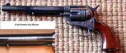 The Colt Frontier or Frontier Six-Shooter was a Colt 1873 "Model P" manufactured in .44-40 Winchester caliber instead of .45 Colt (in which configuration it was called the Single Action Army) so that it was compatible with the new, hugely successful Winchester Model 1873 repeating rifle. Users of both weapons in the Far West appreciated the convenience of being able to carry a single caliber of firearm ammunition. Production of the Model P began in 1877. Colt Frontier Six-Shooter was the actual name of the Colt pistol model, which was acid-etched on the left side of the barrel. After 1889, the legend was roll-stamped, with the designation ".44-40" added in 1919. Later Colt M1878 Double Action Army Models also received this designation on the barrel when chambered in .44 WCF/.44-40 Winchester. The Bisley 1895 Model was the final Colt to wear the Frontier Six Shooter designation.[17]