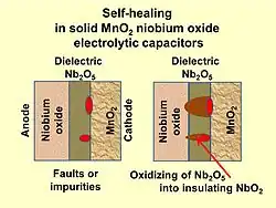 A rare failure in solid electrolytic capacitors is breakdown of the dielectric caused by faults or impurities. In niobium electrolytic capacitors the dielectric is niobium pentoxide (Nb2O5). Besides this pentoxide there is an additional niobium suboxide, niobium dioxide (NbO2). The NbO2 is a semi-conducting material with a higher conductivity than Nb2O5 but much lower than a short. In case of faults or impurities in the dielectric which evokes a partial dielectric breakdown the conducting channel would be effectively isolated by reduction of Nb2O5 into high ohmic NbO2 if energy is limited.