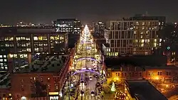 In the 1990s, in an attempt to unify the Short North district and draw customers to the area, a real estate executive proposed the installation of new streetcar arches resembling the historical set. Seventeen were built, lining High Street from I-670 north to just past Fifth Avenue, with a cost of $2.2 million. The first of the new arches were lit on December 4, 2002.[4] These were complemented by similar arches elsewhere in the city, including at the Lennox Town Center shopping complex.[5]