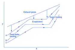 The cycle a-b-c-d-e-f-a which is the Rankine steam cycle takes place at a lower temperature and is known as the bottoming cycle. Transfer of heat energy from high temperature exhaust gas to water and steam takes place in a waste heat recovery boiler in the bottoming cycle. During the constant pressure process 4-1 the exhaust gases from the gas turbine reject heat. The feed water, wet and super heated steam absorb some of this heat in the process a-b, b-c and c-d.