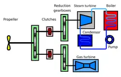 A gearbox and clutches enable either of the engines or both of them together to drive the shaft.[1] It has the advantage of the cruising efficiency and reliability of steam and the rapid acceleration and start-up time of gas. This system was mainly used on first-generation gas-turbine ships such as the Royal Navy's County-class destroyer and Tribal-class frigate.