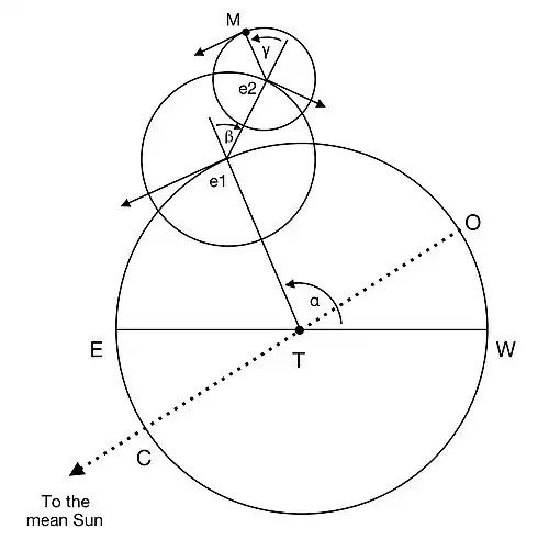 The Moon itself, represented by the point M in the diagram, moves uniformly from west to east around the circumference of the second epicycle so that the period of the angle γ is half a synodic month.[9] Copernicus states that whenever the point e1 lies on the line joining the Earth to the centre of its orbit (represented by the dotted line OTC in the diagram, of which only the point T here lies in the Moon's orbital plane), the Moon M will lie precisely between e1 and e2. However, this can occur only once every 19 years, when this line coincides with the line of nodes WTE. At other times it does not lie in the moon's orbital plane and the point e1 cannot therefore pass through it. In general, then, while the Moon will be close to conjunction or opposition to the Sun whenever it lies precisely between e1 and e2, these events will not be precisely simultaneous.