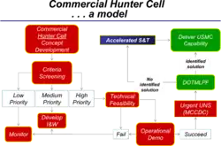The term commercial hunter is also used to describe its participants who "hunt" using commercially available goods. Unlike a "Combat Hunter" who uses professional big-game hunters, trackers, and cops on the beat to modify tactics against irregular forces, the "Commercial Hunter" would use outside experts to anticipate, identify, and defeat commercial technology threats.[2] The Commercial Hunter program would anticipate threats via opposing force exercises using teams of smart, young, web-savvy people, from diverse backgrounds.[2] These "commercial hunters" would identify and prioritize threats, buy from the internet creating a prototype to prove technical feasibility, and provoke action.[2]