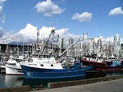 Purse seining is a method of fishing that includes a large net that is used as a barrier to collect a school of fish.[6] A commercial fishing boat, used for purse seining in the Alaskan salmon fishery, is typically between 40 and 58 feet (18 m) long. Toward the bow is a cabin, where the skipper and crew live (typically three to six people). The aft third of the boat consists of a flat deck, with a low rail around it. Amidships are hatch covers, which cover the fish hold, a tank where the fish are placed when caught. The stern is a simple flat area that holds the purse seine when it is out of the water. There are several booms, with various types of pulleys, used for working with the seine, and a deck winch for the same purpose. Shortly after the end of World War II, the modern type trawler for use in Alaska was introduced which could be used for all the various fishing seasons with its own processing ability, including freezing, was introduced, tripling production. After crab season these boats are used as floating factory ships.[7]