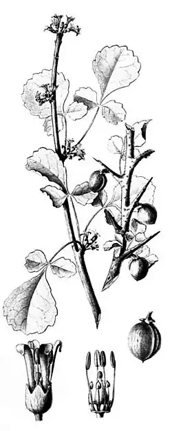 Closely related to C. glandulosa, C. africana is usually some 5m tall, its branchlets often ending in spines. Its bark is grey-green, peeling to reveal a shiny surface, red when damaged, and then exuding bdellion, a clear, edible, aromatic gum ('Commiphora'='gum-bearing'). The leaves are trifoliate with a large terminal leaflet and two small side leaflets, bluntly toothed, and, as with most Commiphoras, pleasantly aromatic when crushed. Fruits are reddish, and about 6–8 mm across, splitting when ripe to reveal a hard, black seed held by a pseudo-aril or mericarp with four red fingers, resembling the clasps holding a jewel in a brooch or ring setting. The tree's fruits are edible while the succulent, sweet roots are often chewed by humans, and the new leaves are sought after by camels and goats, particularly at the beginning of the dry season.