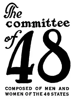 The Committee of 48 traces its roots to January 1919, when a gathering of individuals interested in public affairs gathered in New York City.[1] Those so assembled decided that a formal organization should be sponsored and decided to issue a call for a National Conference.[1] The name "Committee of 48" was chosen as a reflection of the desire to form a national organization bringing together interested representatives of each of the nation's 48 states.[1]
