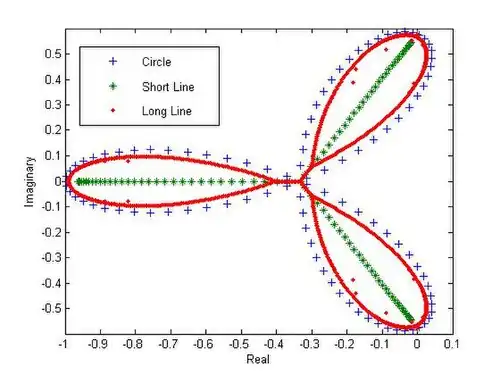 The eigenvalues of a circle, short line, and long line plotted in the complex plane