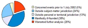 Every time a complaint is received, the Prosecutor must "analyse the seriousness of the information received"[8] and decide whether there is a reasonable basis to open an investigation. The process begins with an initial review, during which many of the communications received are dismissed as "manifestly outside the jurisdiction of the Court". Of the communications received before 1 February 2006, 80% were dismissed for the following reasons: