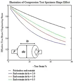 The geometry of test specimens and friction can significantly influence the results of compressive stress tests.[3][4] Friction at the contact points between the testing machine and the specimen can restrict the lateral expansion at its ends (also known as 'barreling') leading to non-uniform stress distribution. This is discussed in section on contact with friction.