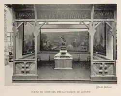 The Comptoir de Longwy made some efforts to get more attention and notice in the business world. This was limited to the sales of pig iron, while for by-products and further manufactured products the member firms took the initiative, so for instance in 1889 the Acieries de Longwy for slag phosphate. So the advertising of the Comptoir had to be more general and mediate. At the Paris Exposition Universelle (1900) the Comptoir showed an elegant salon decorated with paintings by Édouard Rosset-Granger that mainly depicted the picturesque aspects of iron ore mining, although one showed the casting of a blast furnace. At the 1909 Exposition Internationale de l'Est de la France in Nancy the booth held three large paintings by Rosset-Granger that were usually hung in the Comptoir's directorial office. They represented exploitation of Côte Rouge ore, a view of a blast furnace and a casting of metal.[13]