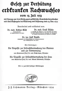 Law for the Prevention of Genetically Diseased Offspring (German: Gesetz zur Verhütung erbkranken Nachwuchses) or "Sterilisation Law" was a statute in Nazi Germany enacted on July 14, 1933, (and made active in January 1934)[1] which allowed the compulsory sterilisation of any citizen who in the opinion of a "Genetic Health Court" (Erbgesundheitsgericht) suffered from a list of alleged genetic disorders – many of which were not, in fact, genetic. The elaborate interpretive commentary on the law was written by three dominant figures in the racial hygiene movement: Ernst Rüdin, Arthur Gütt and the lawyer Falk Ruttke.