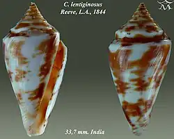 - ^ Kohn, A. (2013). "Conus lentiginosus". IUCN Red List of Threatened Species. 2013: e.T192366A2080972. doi:10.2305/IUCN.UK.2013-1.RLTS.T192366A2080972.en. Retrieved 20 July 2024.