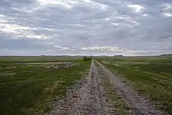 The tracks for the “Milwaukee Road” railroad have been removed East and West of Conata Basin Rd, all but one section of track which still lies under the dirt road. The ends of the rails are visible on either side of the road. (See photos)
