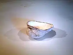 The shell is shaped almost like that of an abalone, with a very large aperture compared to other muricids. A loco cannot hide completely inside the shell if it is turned upside down, so has no need of its operculum; instead, it relies on its strong foot to remain in place. The shell is made of calcite with an inner layer of aragonite.[3]