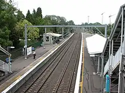 ![]() Northbound view from Platform 2, showing the pedestrian footbridge and station concourse in April 2018 | |||||||||||