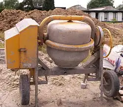 A concrete mixer (also cement mixer) is a device that homogeneously combines cement, aggregate (e.g. sand or gravel), and water to form concrete. A typical concrete mixer uses a revolving drum to mix the components. For smaller volume works, portable concrete mixers are often used so that the concrete can be made at the construction site, giving the workers ample time to use the concrete before it hardens. An alternative to a machine is mixing concrete by hand. This is usually done in a wheelbarrow; however, several companies have recently begun to sell modified tarps for this purpose.