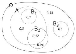 In probability theory, conditional probability is a measure of the probability of an event occurring, given that another event (by assumption, presumption, assertion or evidence) is already known to have occurred.[1] This particular method relies on event A occurring with some sort of relationship with another event B. In this situation, the event A can be analyzed by a conditional probability with respect to B. If the event of interest is A and the event B is known or assumed to have occurred, "the conditional probability of A given B", or "the probability of A under the condition B", is usually written as P(A|B)[2] or occasionally PB(A). This can also be understood as the fraction of probability B that intersects with A, or the ratio of the probabilities of both events happening to the "given" one happening (how many times A occurs rather than not assuming B has occurred): .[3]