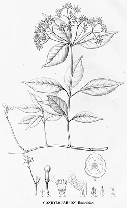 | Botanical illustration of Condylocarpon isthmicum (using the synonymous name Condylocarpon rauwolfiae) | |