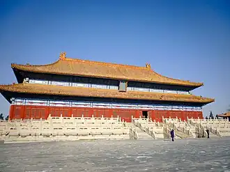 Another important revision made in Yuan dynasty was change of architectural style. Spirit tablet of the Emperor's ancestor (and also a predecessor) who were not given immovable status inside the main shrine building were later replaced to different shrine buildings (祧廟), yet protocol of how to operate such buildings was not stable. Reforms in Yuan dynasty introduced constructing new two annex buildings, in front and behind of the main shrine building (which is keeping only 7 miao rooms for ancestors) respectively. While the frontside building functioned as hall for holding worshipping ceremonies, the backside building functioned as resting place where spirit tablet of ancestors removed from the main building comes in. This new architectural style of three buildings (三殿), was continued to late Chinese empires Ming and Qing.[7]: 123(5) It is still can be observed in present-day remnants of the 'Imperial Ancestral Temple' as 'Working People's Cultural Palace' in Beijing.[3]: 558