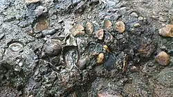 Two recognized types of intraformational conglomerates are shale-pebble and flat-pebble conglomerates.[6] A shale-pebble conglomerate is a conglomerate that is composed largely of clasts of rounded mud chips and pebbles held together by clay minerals and created by erosion within environments such as within a river channel or along a lake margin.[7] Flat-pebble conglomerates (edgewise conglomerates) are conglomerates that consist of relatively flat clasts of lime mud created by either storms or tsunami eroding a shallow sea bottom or tidal currents eroding tidal flats along a shoreline.[8]