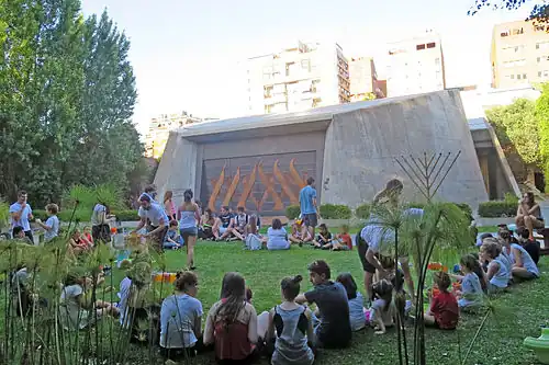 During the construction of the building, a design contest was held for a Tree of life art piece in the temple garden to honor the memory of congregants' loved ones. Submissions were submitted anonymously with pseudonyms, and a design by Clorindo Testa was chosen. The aim of the piece was to have bronze leaves representing lost loved ones illuminated by an eternal flame.