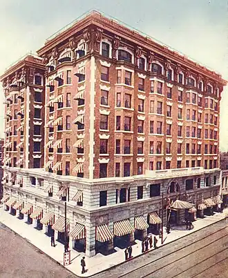 The Connor Hotel officially opened Sunday, April 12, 1908, but had a soft opening a few days earlier.[3] Throughout the years, the hotel featured restaurants, multiple dining rooms, a coffee shop, barber shop, beauty salon, billiards room, cigar shop, and a bar (until prohibition closed it in 1919). It even ended up having its own orchestra, newspaper, and entertainers.[4] In 1915, an enclosed rooftop garden was added to the building. The structure was designed by local architect Austin Allen, who designed the nearby Newman Brothers Building and the Olivia Apartments.