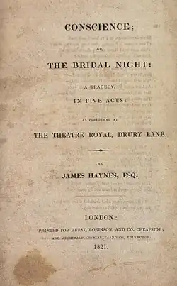 Conscience; or, The Bridal Night is an 1821 tragedy by the Irish writer James Haynes. It premiered at the Theatre Royal, Drury Lane in London on 21 February 1821.[1] The original cast included Sarah West as Elmira, John Powell as Duke of Venice, John Cooper as Arsenio, James William Wallack as Lorenzo. It was acted five times on its original run.[2] It then appeared at the Anthony Street Theatre in New York in May 1821.[3] Haynes dedicated the play to James Perry. John Genest considered the play's language better than its plot.[4]