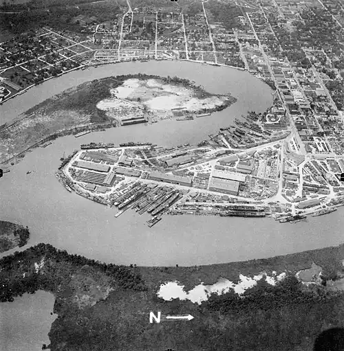 Orange shipyard in 1945, Levingston Shipbuilding Company just below the upper bend