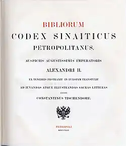 - ^ Parker, David C. (2015). "The Discovery of the Codex Sinaiticus". The Codex Sinaiticus: New Perspectives on the Ancient Biblical Manuscript. Peabody, MA: Hendrickson Publishers. pp. 15–30. ISBN 978-1-61970-645-3.