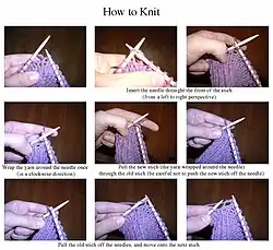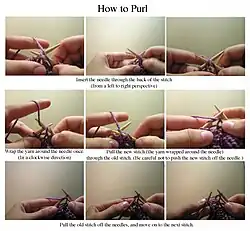 The motion of the right wrist is used to slip the right needle into the loop of the stitch being knitted and 'scoop' or 'hook' the yarn onto the right needle. [2] An alternative method of collecting the yarn involves using the thumb or index finger of the right hand to hold the yarn in place as the new stitch is being pulled out of the loop.
