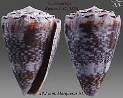 Conus encaustus, common name the burnt cone, is a species of sea snail, a marine gastropod mollusk in the family Conidae, the cone snails and their allies.[3]