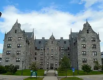 Converse Hall is located on the east side of the UVM campus, in an area that was somewhat isolated when the hall was built, but is now dominated by the University of Vermont Medical Center to the north. The hall is a U-shaped structure 4+1⁄2 stories in height, with the opening of the U facing west toward the central campus area. Its exterior is finished in Vermont marble, with sash windows set singly and in pairs in plain rectangular openings. Each wing of the U has projecting sections near the center, which give their roof lines a cruciform appearance. The gable ends are decorated with finials and turrets, and the roofs are dotted with attic and wall dormers that have similarly styled gables.[2]