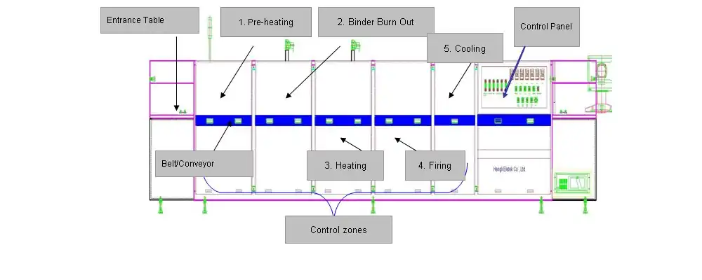 Conveyor furnaces typically adopt a tunnel structure and contain multiple controlled zones including preheating, binder burn out, heating, firing, and cooling. A conveyor furnace also features fast thermal responses, uniform and stable temperature distribution. Some can heat treated parts to around 1050 °C. The belt speed of a conveyor furnace can be as high as to 6000 mm/min. Products are heated efficiently by infrared radiation (a furnace can also use ceramic heaters or IR lamps) and are dried and fired after passing through the controlled zones, followed by rapid cooling.