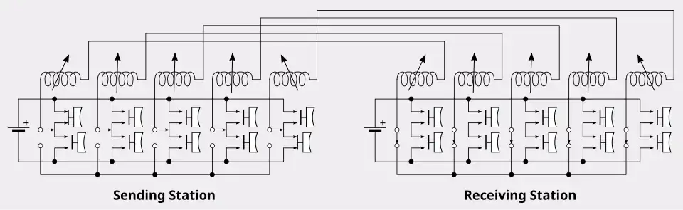 At the sending end there were two rows of buttons, a pair of buttons for each coil in each row. The operator selected one button from each row. This connected two of the coils to the positive and negative ends of the battery respectively. The other ends of the coils were connected to the telegraph wires and thence to one end of the coils at the receiving station. The other ends of the receiving coils, while in receive mode, were all commoned together. Thus the current flowed through the same two coils at both ends and energised the same two needles. With this system the needles were always energised in pairs and always rotated in opposite directions.[31]