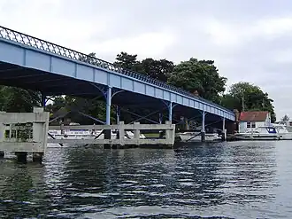 On 17 July 1866 the Cookham Bridge Company announced that a new iron bridge would be built and requested designs. 37 schemes were submitted and the contract was awarded to Messrs Pease, Hutchinson & Co Ltd of the Skerne Ironworks, Darlington for a bridge of two wrought iron girders supported by eight pairs of concrete-filled iron pillars.[7] The estimated cost was £2,520 (equivalent to £294,880[5]), some £1000 cheaper even than the estimate for the 1840 wooden construction. The remarkably low cost, due to Pease & Hutchinson being major iron manufacturers and prolific bridge builders, led to the new bridge being known as "the cheapest bridge on the River for its size".[8]