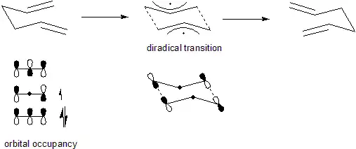 The Cope rearrangement is the prototypical example of a concerted sigmatropic rearrangement. It is classified as a [3,3]-sigmatropic rearrangement with the Woodward–Hoffmann symbol [π2s+σ2s+π2s] and is therefore thermally allowed. It is sometimes useful to think of it as going through a transition state energetically and structurally equivalent to a diradical, although the diradical is not usually a true intermediate (potential energy minimum).[5] The chair transition state illustrated here is preferred in open-chain systems (as shown by the Doering-Roth experiments). However, conformationally constrained systems like cis-1,2-divinyl cyclopropanes can undergo the rearrangement in the boat conformation.