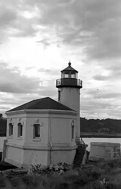 The Coquille River Lighthouse,[8] commissioned in 1896, guided mariners to find the dangerous bar at the mouth of the Coquille. The lighthouse was built on or near Rackleff Rock, a rocky obstacle in the channel. The rock became part of the bulwark of the North Jetty area. The lighthouse was decommissioned in 1939, following the last of improvements to the river channel.