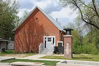 Coralville's first church was a frame structure built by a Methodist Episcopal congregation.[2] It was destroyed in a fire around 1880. The Coralville Union Ecclesiastical Society was formed to build a new church. The simple brick structure with a gable roof was built about 1885 to serve as a multi-denominational church on the main floor and as a town hall on the lower level. Any orthodox church, which excluded the Unitarians or Universalists, could use the building.[2] In addition to the town's administration, the lower level could be used for a variety of social functions, excluding dancing. The town purchased the building in 1921 for $2,500,[3] and it was used as a school, a meeting house for the Evangelical Free Church, and as the town's administrative center. It was renovated for the later purpose in 1953.