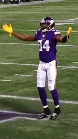 Patterson had an opportunity to reacquire his starting position after veteran wide receiver Greg Jennings was released during the off-season.[55] After newly signed veteran Mike Wallace established himself as the starter and rookie Stefon Diggs emerged as a premier receiver in Charles Johnson's absence, Patterson was dropped to fifth position and relegated to return duties. He received minimal play at wide receiver throughout the season, only amounting two receptions for 10 yards all season. However, Patterson had two kick return touchdowns, the first in Week 10 against the Oakland Raiders and the second in Week 13 against the Seattle Seahawks.[56][57][58]