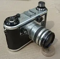 The Periflex 35mm camera range was launched by K. G. Corfield Ltd, England in May 1953 with the "Periflex 1" . Subsequent models used the same general form and layout with improvements to the viewfinder design and surface finishes. The camera resembles the Leica Standard and qualify as a Leica copy. However, film loading is by way of a removable back. Focusing is provided through the lens using an inverted periscope lowered into the light path between the lens and the film allowing a small section of the full image to be viewed. The Periflex became quite popular in Britain and several improved models were introduced until their demise in the early 1960s.[1][2][3]