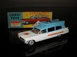 By 1959 the M1, the UK's first motorway, had opened to the public and this prompted the introduction of a new breed of powerful police vehicle able to carry a large payload. The Ford Zephyr Motorway Patrol Car (419) was introduced in August 1960 and was finished in white with a plastic aerial fitted to the front wing, a blue light attached to the roof, a 'Police' decal on the bonnet and a vac-formed interior detailing rescue equipment in the luggage compartment and in June 1962 the Oldsmobile Super 88 County Sheriff car (237) was added to the range. Painted black and white it featured a red light fitted to the roof and 'County Sheriff' stickers on the doors. This model became the company's first million seller. The Superior Ambulance on Cadillac Chassis (437) introduced in October 1962 was from the latest generation of models and featured red and white paintwork, a working battery operated flashing light on the roof and four trans-o-lite fibre optic lights in each corner of the roof that flashed in unison with the main bulb. This model was re-issued in blue and white in 1966. In January 1963 the existing Chevrolet Impala was introduced as a Fire Chief car (439), painted red with a light on the roof, crests decals on the doors and a 'Fire Chief' transfer on the bonnet, and was also updated with a red and white finish in 1966. In June 1963 the Commer Police Van (464) was released, painted blue with a battery operated flashing light on the roof, barred side windows and 'County Police' transfers along the sides, and this model was also updated in 1967. An ambulance version (463) painted white was issued in February 1964.