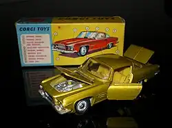 The Corgi design team came up with the first model with an opening feature in February 1960, the Aston Martin DB4 (218) which had an opening bonnet. Steerable front wheels, jewelled headlights and rear lights and an opening boot complete with spare wheel were added on the Bentley Continental Sports Saloon (224) in April 1961, and by October 1963 with the release of the Ghia L6.4 (241) new levels of authenticity were reached. This model featured a number of 'firsts' with not only an opening bonnet, but also opening doors and boot, and a detailed interior with a rear view mirror, folding front seats, and even a model corgi dog sitting on the rear parcel shelf. At introduction, the Ghia sold for eight shillings and sixpence, and even at this relatively high price around 1.7 million were sold before being withdrawn in 1969. By contrast, only twenty five examples of the real car were completed![7] Another popular model was the Jaguar Mark X (#238; 1962–1967) — over 1.1 million were sold, and hardly any other model was released in as many colours.[8]